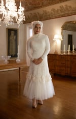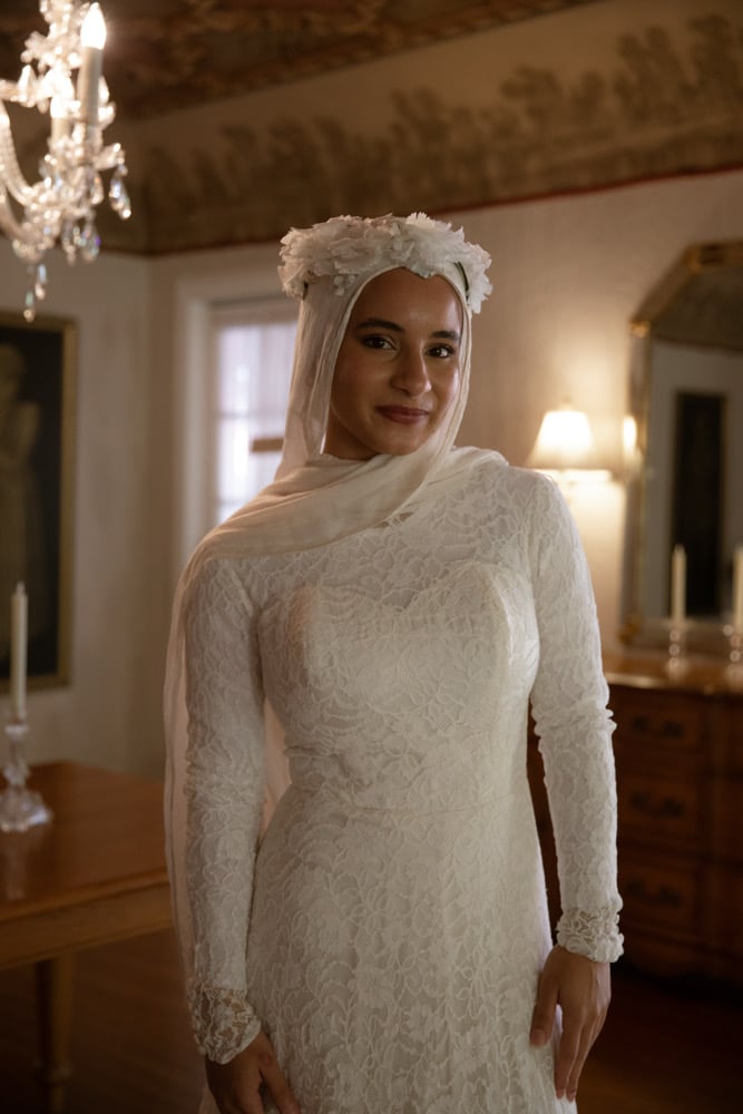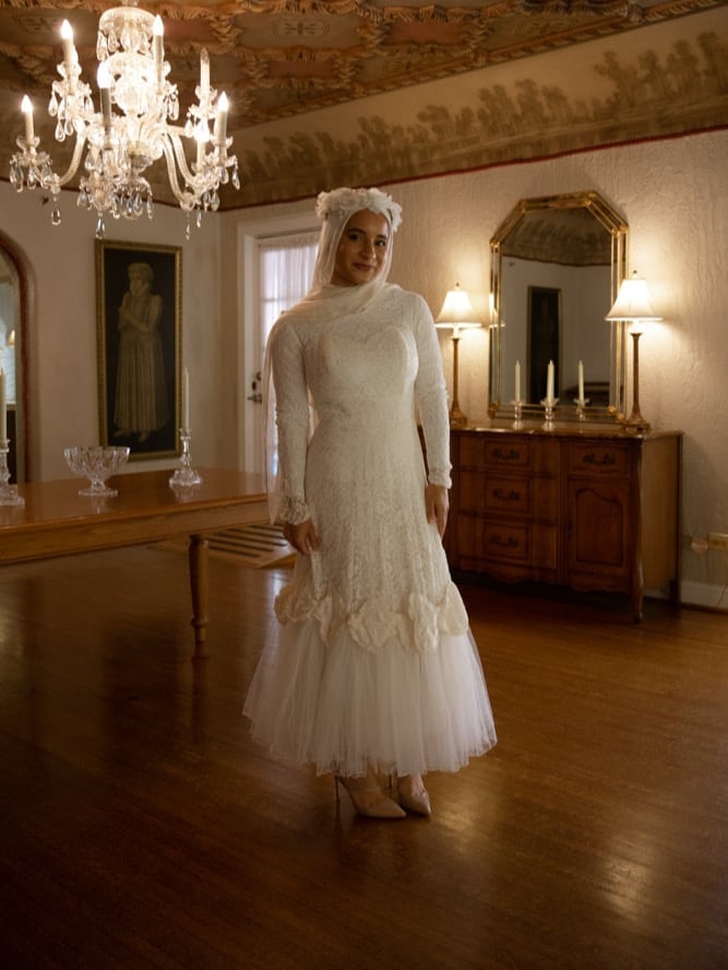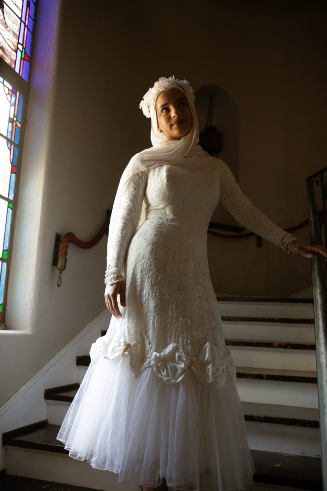 Lace wedding dress from the 1950s with a high neckline and a structured, boned bodice. Long sleeves fasten at the wrist with covered buttons. The silhouette is fitted through the bodice and hips, flaring past the knees into a trumpet-style skirt.