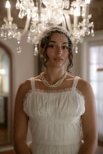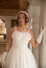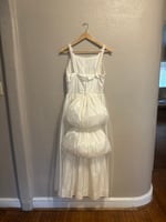 The dress features a fitted bodice with a nipped waistline and full skirt. The back of the dress features a unique design inspired by the gilded age with draping bustle designs that add volume and dimension. You can add tissue paper inside the bustles to give them more shape.
