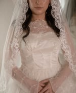 Timeless veil with a classic style featuring tulle trimmed in scalloped lace. Vintage veils can be hard to find, so we have carefully sourced modern veil options that pair perfectly with vintage gowns!